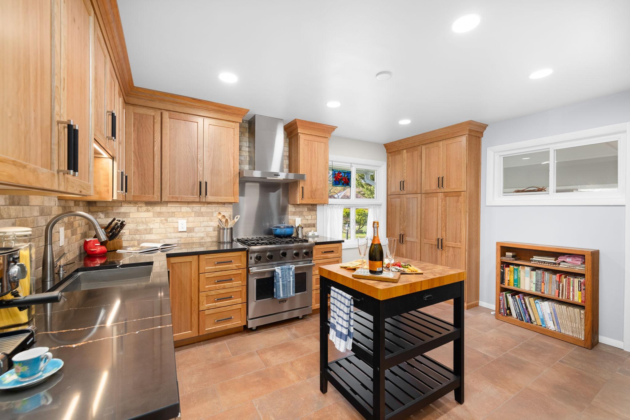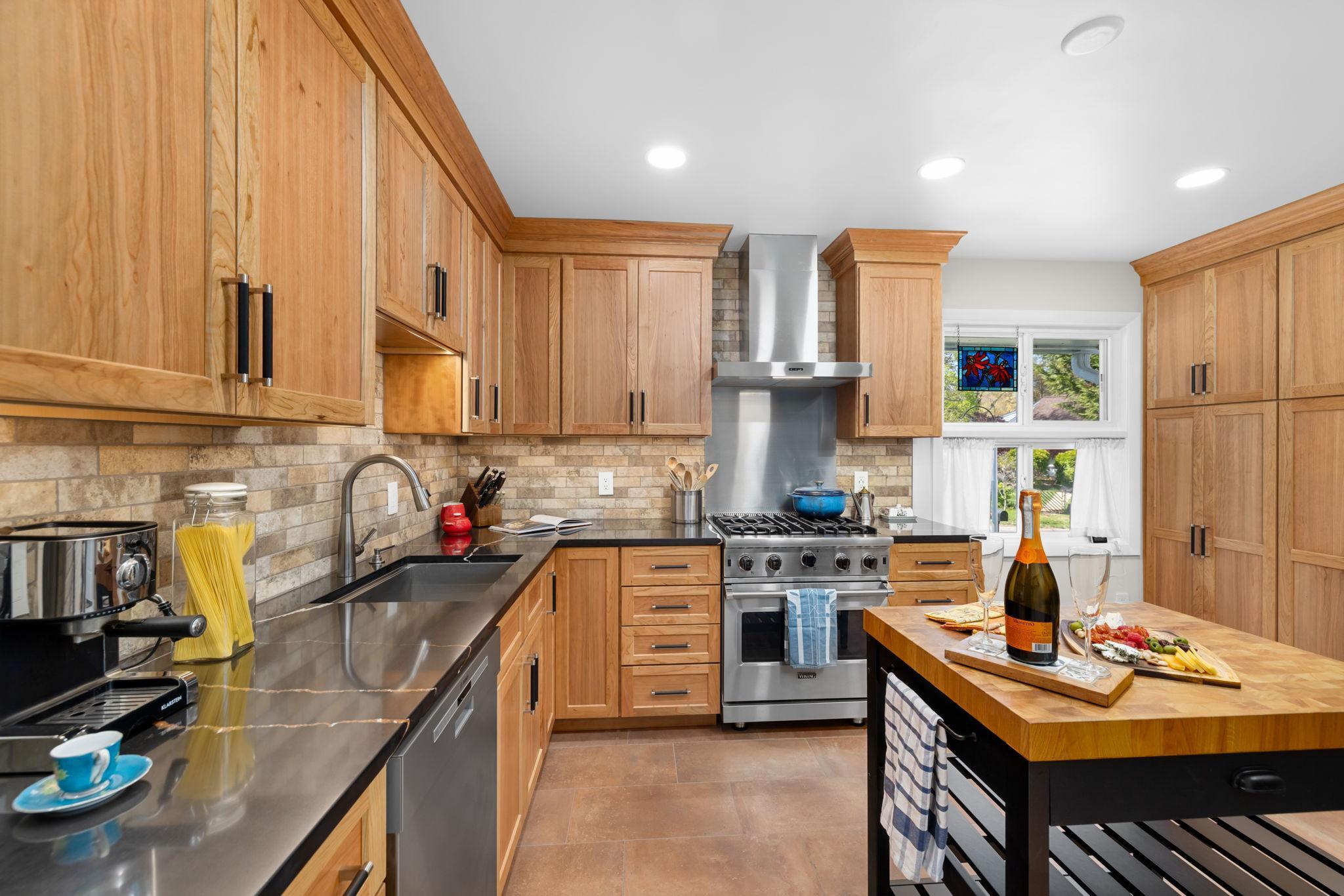 A professional-grade range and streamlined ventilation hood anchor the cooking zone, creating a focal point that balances performance with design. The surrounding layout was carefully planned to maximize prep space, storage, and accessibility—delivering a kitchen that works as beautifully as it looks.