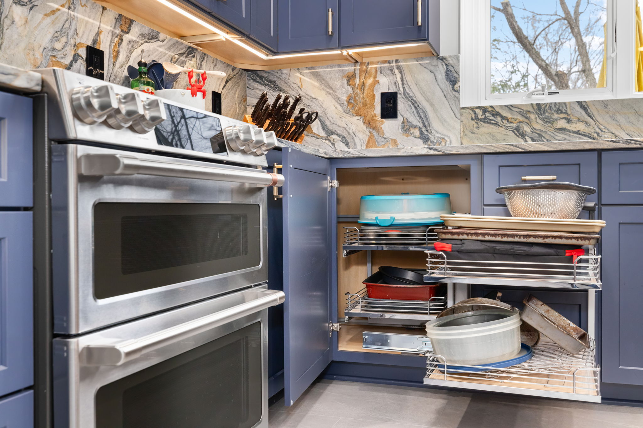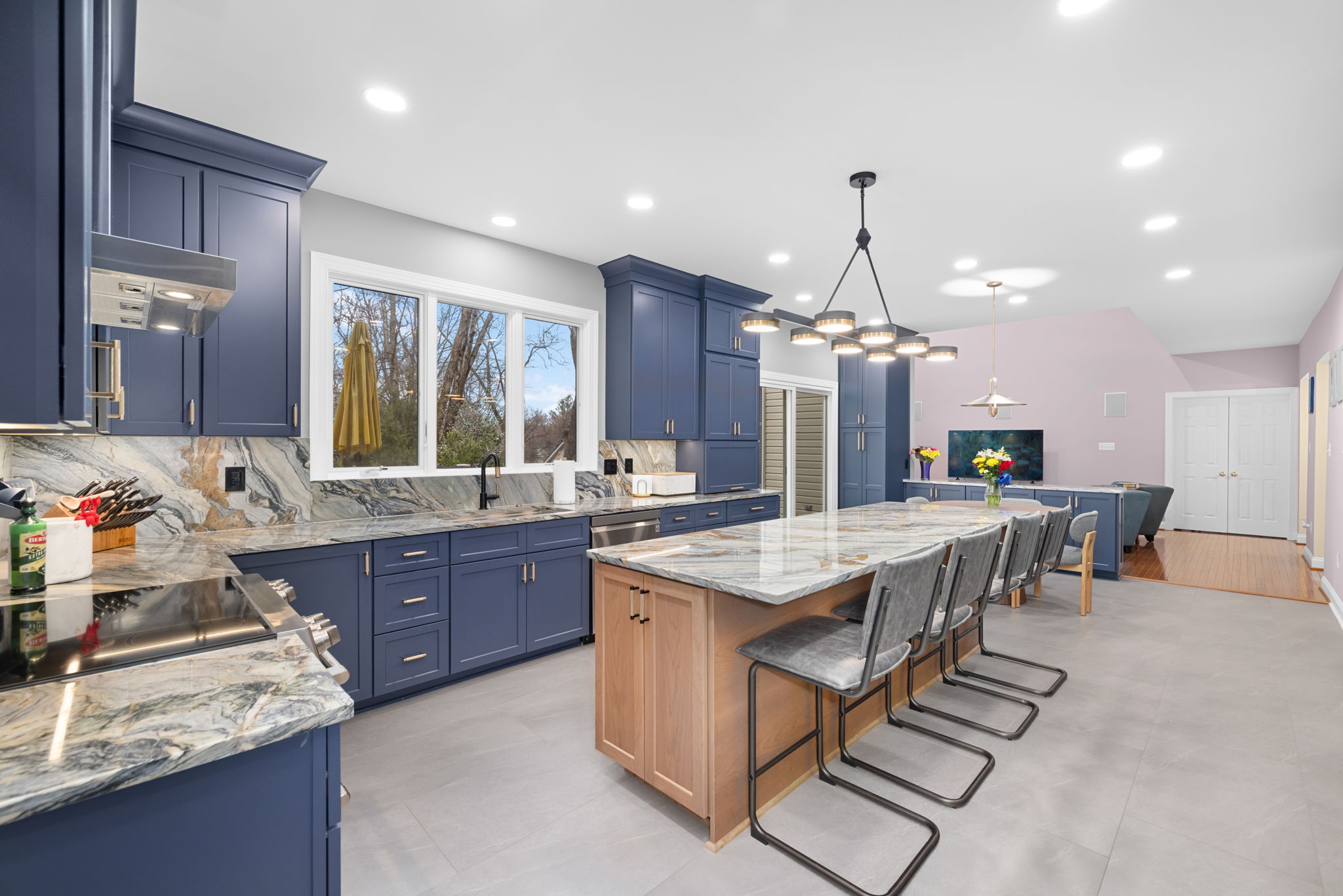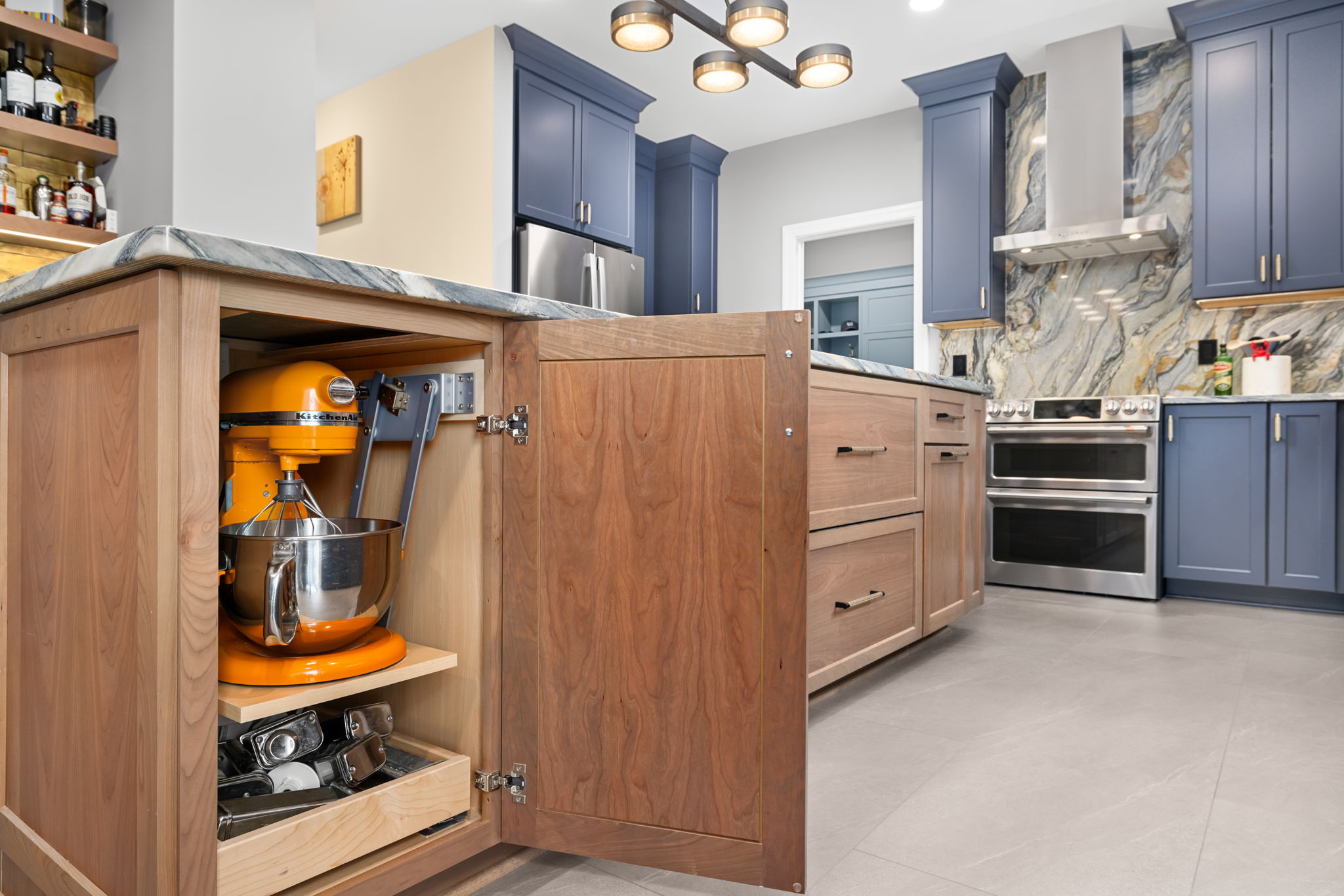 The result is a bold yet refined kitchen centered around deep blue custom cabinetry, dramatic natural quartzite countertops and full-height backsplash, and a warm wood island that softens the palette while creating a welcoming focal point. Every detail was designed to maximize both beauty and usability, with thoughtful upgrades including a hidden mixer lift, appliance garage, pot and pan drawers, drawer microwave, and a magic corner cabinet to make every inch of storage work harder.