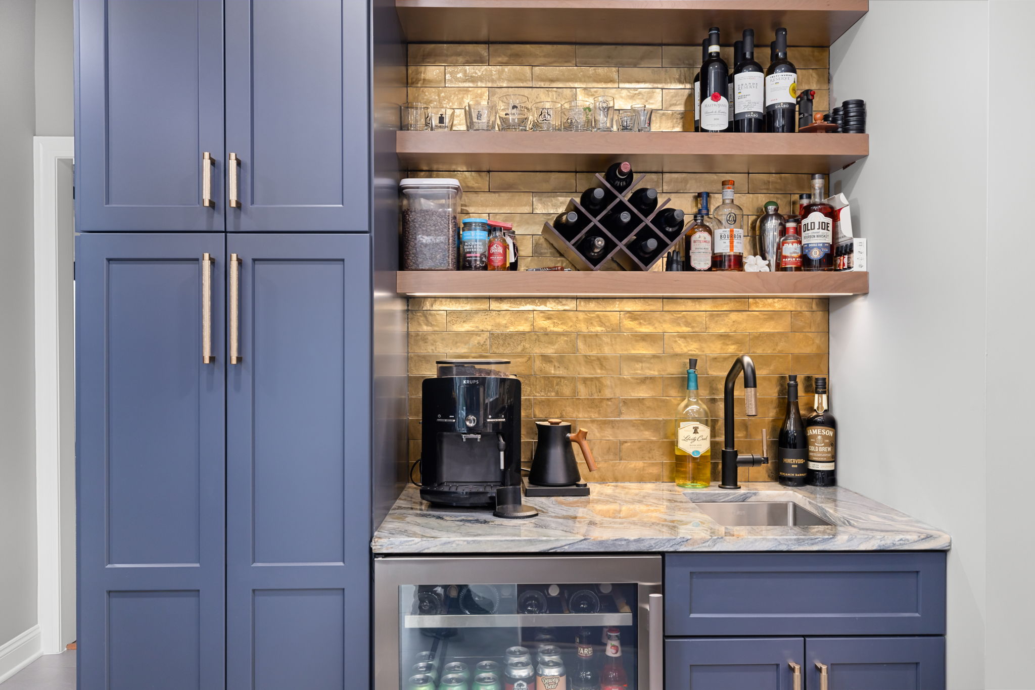 Just beyond the main kitchen, a stylish wet bar and beverage station adds both function and personality. Featuring a beverage cooler, prep sink, floating wood shelves, and eye-catching metallic gold tile backsplash, this area creates a distinct entertaining zone while complementing the kitchen’s overall design. A mix of brushed brass and black hardware and lighting adds contrast, sophistication, and a custom feel throughout the space.