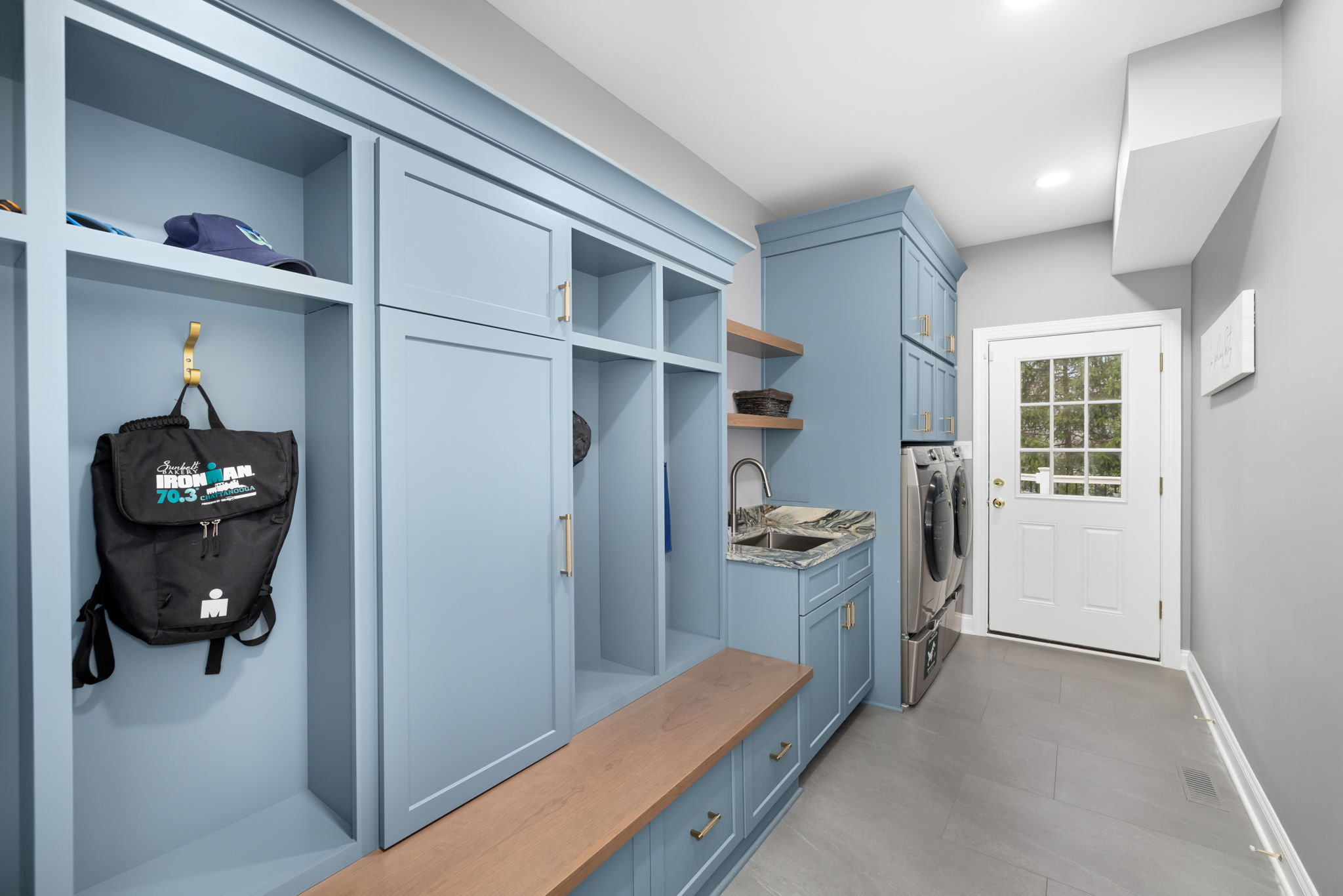 The transformation continues into the newly designed mudroom and laundry area, where elegant built-in lockers create a polished everyday “drop zone” for bags, coats, shoes, and daily essentials. Paired with a utility sink, built-in washer and dryer, and abundant cabinetry for cleaning and household storage, this hardworking space brings order and ease to busy family life.