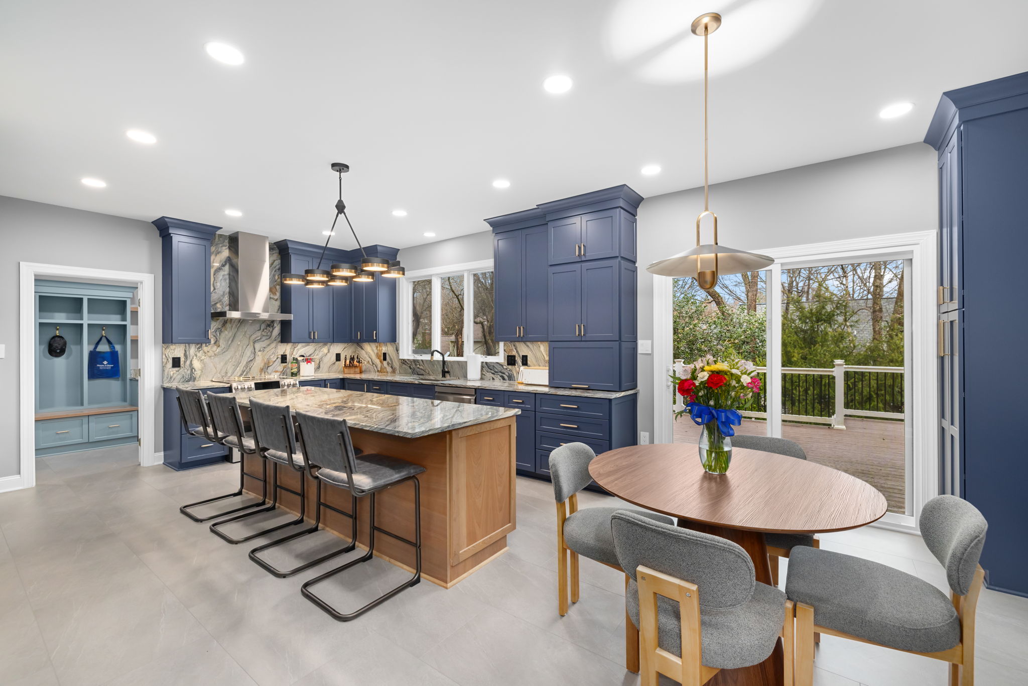 This complete North Potomac home renovation transformed the home’s main living hub into a stunning, highly functional space for cooking, gathering, entertaining, and everyday organization. Deep blue cabinetry, dramatic quartzite surfaces, a warm wood island, and custom storage solutions bring beauty and practicality together in one cohesive design.
