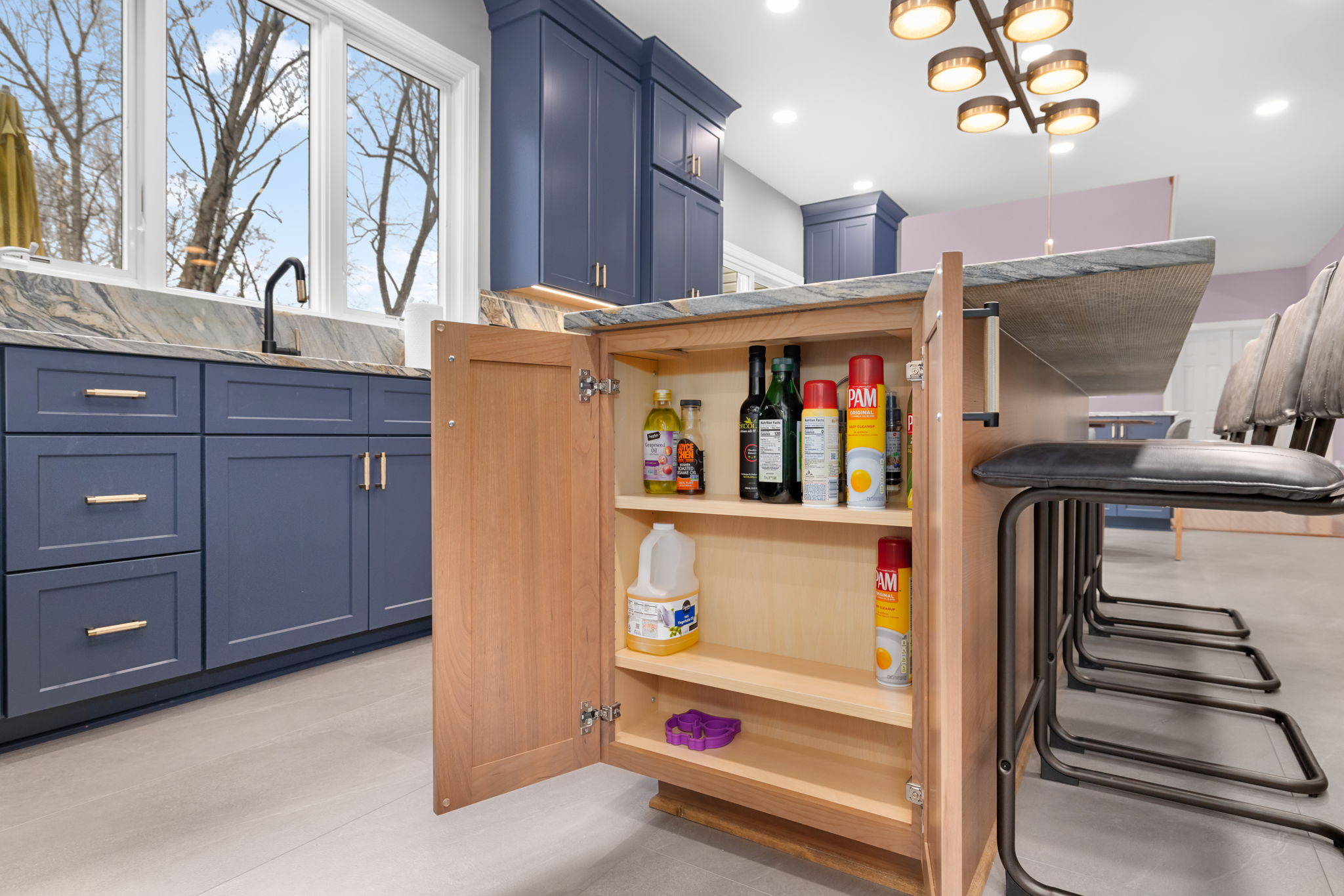 Layered lighting — including recessed lights, under-cabinet lighting, statement pendants, and decorative accent lighting — completes the renovation and gives the entire home a bright, elevated, and inviting atmosphere. This North Potomac remodel is a perfect example of how thoughtful design-build remodeling can blend luxury, storage, organization, and style into one seamless everyday living experience.